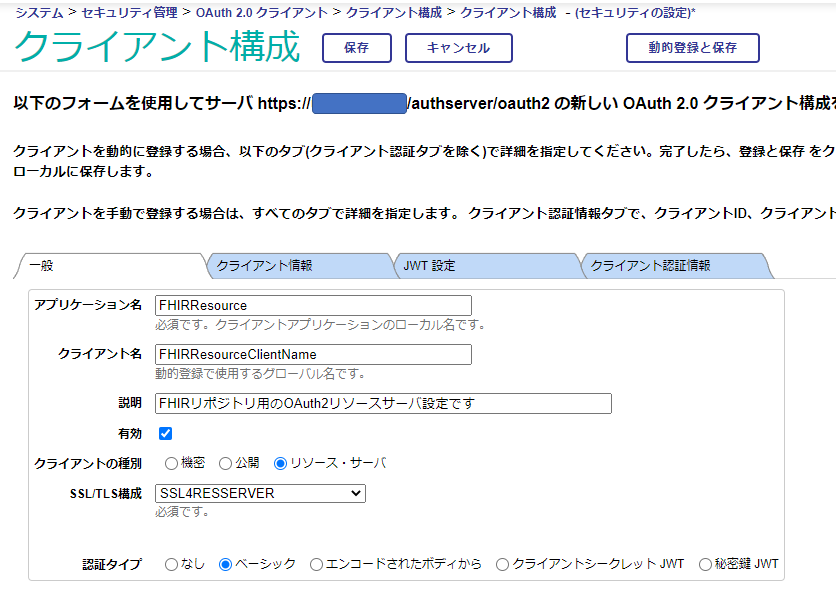 最初に、クライアントの種別=リソース・サーバ を選択すると、下記入力画面と同じになります。