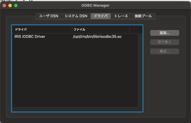 以下のドライバパネルの所でIRIS用のiODBCドライバを設定します。