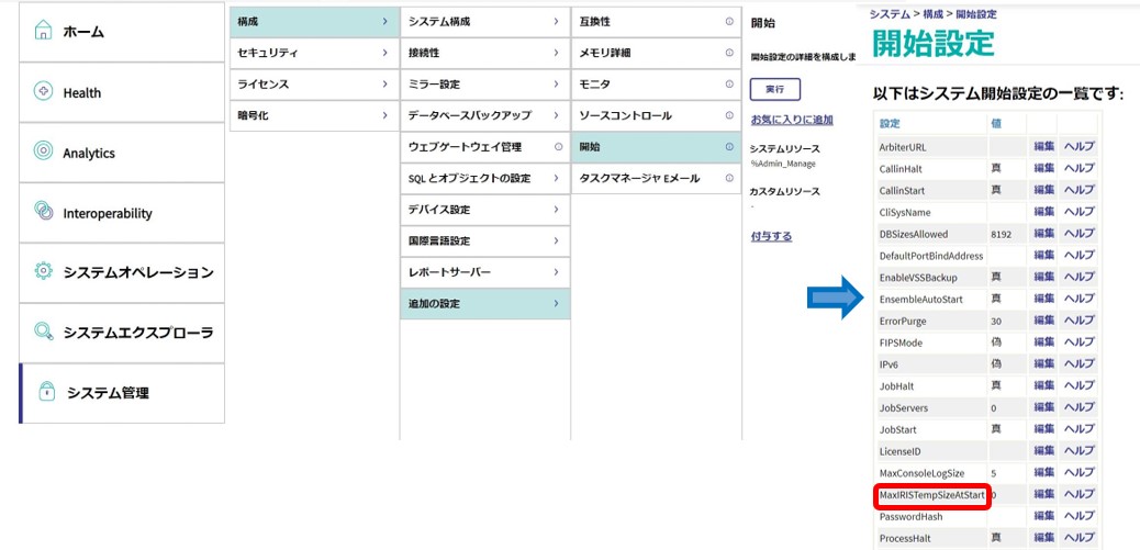 [システム管理]>[構成]>[追加の設定]>[開始]>"MaxIRISTempSizeAtStart"