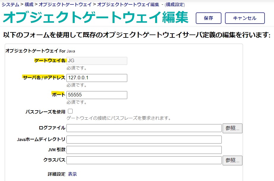 管理ポータル > [システム管理] > [構成] > [接続性] > [オブジェクトゲートウェイ] の画面で Java ゲートウェイサーバを作成します。
