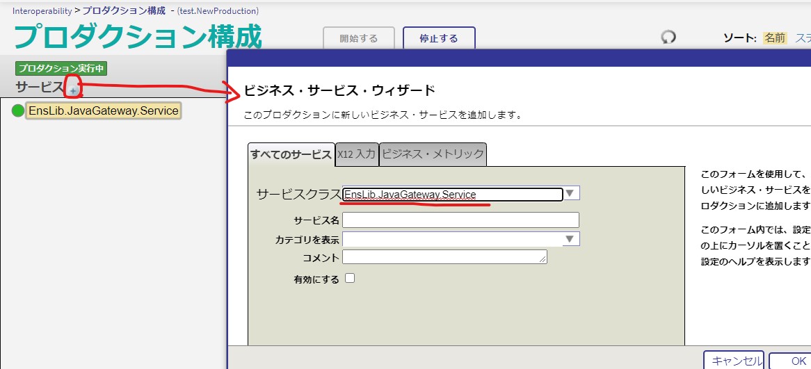 サービスの右側にある + のボタンをクリックし [EnsLib.JavaGateway.Service] を追加します。