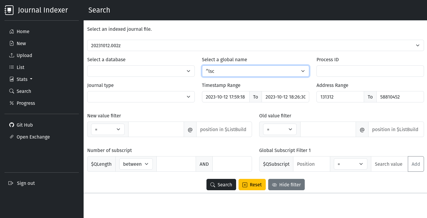 ; ex: to keep 7 indexed journalsDo##class(dc.journalindexer.services.Config).SetMaxJournalRetention(7)さらに、個人的な意見としては、この種のツールを実稼動システムに直接インストールするのはお勧めしません。 Journal File Indexer では外部ログファイルのアップロードを簡単に行えます。 このツールは、テストシステムで使用してから、必要に応じてデータをエクスポートすることをお勧めします。