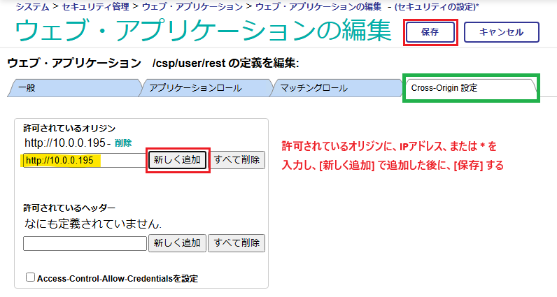 管理ポータルの、[システム管理] > [セキュリティ] > [アプリケーション] > [ウェブ・アプリケーション] RESTアプリケーション(例:/csp/user/rest)より、