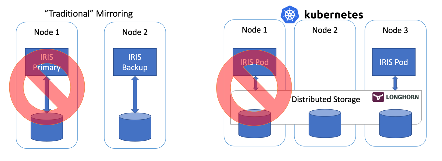 InterSystems IRISの高可用性について言えば、これまでミラーリングの使用が勧められてきました。 ミラーリングでは、データは、常時オンライン状態にある2つのIRISインスタンスが同期的に複製されます。 各ノードにはデータベースの完全なコピーが維持され、プライマリノードがオフラインになると、ユーザーはバックアップノードに接続し直すことができます。 基本的に、ミラーリング手法では、計算とストレージの両方の冗長性は、IRISが管理するものです。