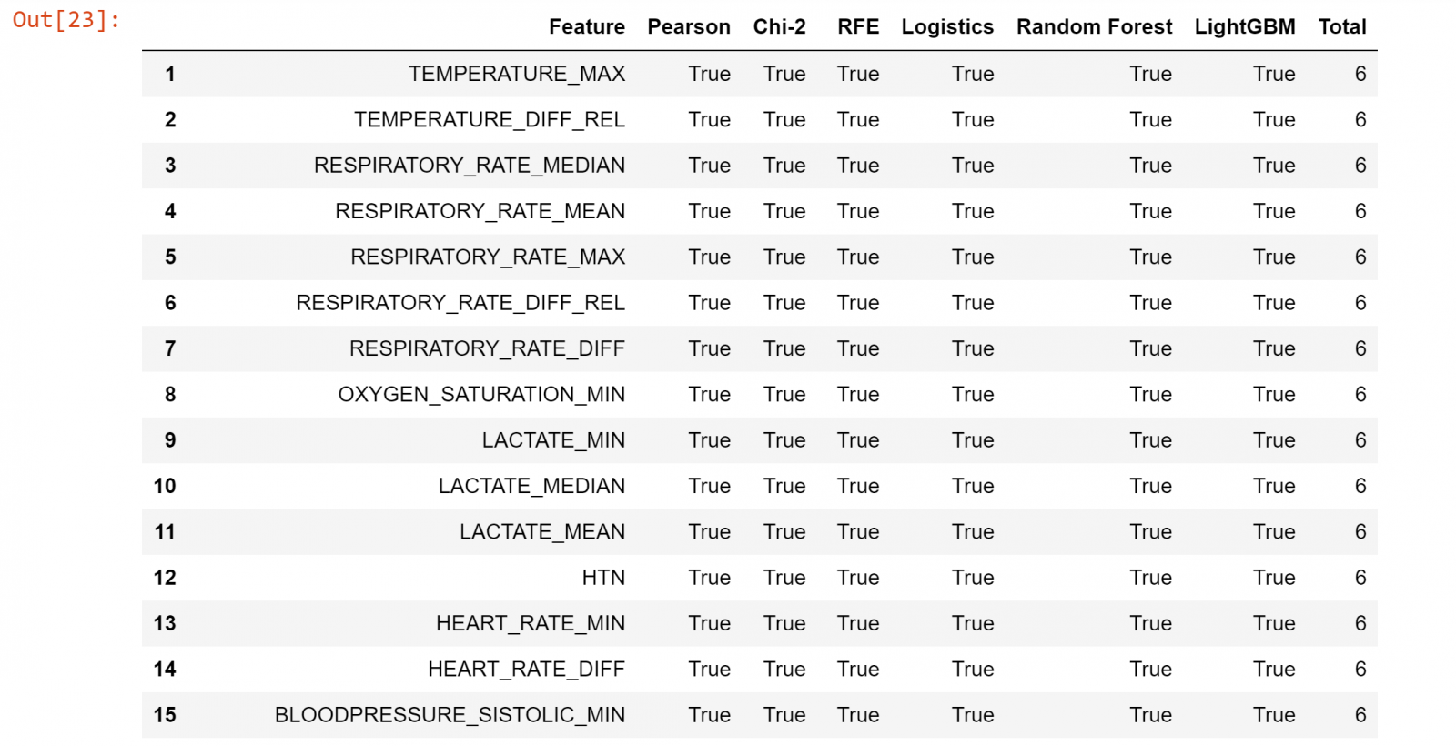 print(str(len(chi_feature)), 'selected features', chi_feature)88 selected features ['AGE_ABOVE65', 'GENDER', 'DISEASE GROUPING 1', ... ... 'P02_VENOUS_MIN', 'P02_VENOUS_MAX', ... ... RATURE_MAX', 'BLOODPRESSURE_DIASTOLIC_DIFF', ... ... 'TEMPERATURE_DIFF_REL', 'OXYGEN_SATURATION_DIFF_REL']