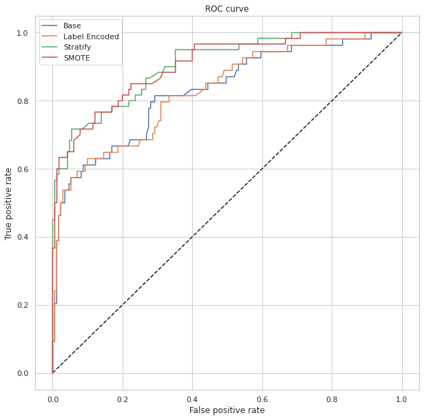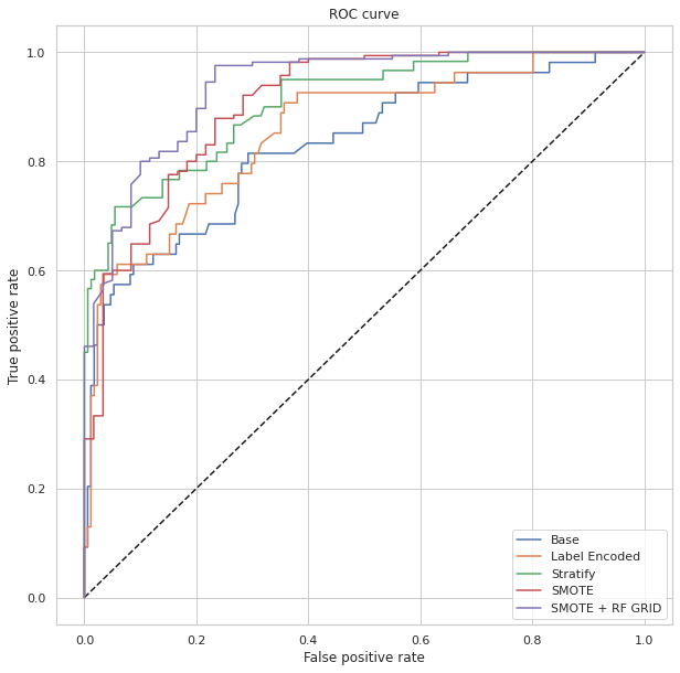 confusion_matrix4 = pd.crosstab(y3_test, rf_predictions, rownames=['Actual'], colnames=['Predicted']) sns.heatmap(confusion_matrix4, annot=True, fmt = 'g', cmap="YlOrBr")print("LABEL ENCODING + STRATIFY") print(classification_report(y3_test, 1-y3_hat)) print("AUC = ",roc_auc_score(y3_test, 1-y3_hat),'\n\n')print("SMOTE") print(classification_report(y3_test, 1-y_res_hat)) print("AUC = ",roc_auc_score(y3_test, 1-y_res_hat), '\n\n')print("SMOTE + LBG Selected Weights + RF Grid Search") print(classification_report(y3_test, rf_predictions)) print("AUC = ",roc_auc_score(y3_test, rf_predictions), '\n\n\n')y_res_hat_probs = LR.predict_proba(X3_test) y_res_hat_probs = y_res_hat_probs[:, 1]predictions_rf_probs = rf_best_grid.predict_proba(X3_test) #(X_validation) predictions_rf_probs = predictions_rf_probs[:, 1]fpr_res, tpr_res, _ = roc_curve(y3_test, 1-y_res_hat_probs) fpr_rf_res, tpr_rf_res, _ = roc_curve(y3_test, predictions_rf_probs)plt.figure(figsize=(10,10)) plt.plot([0, 1], [0, 1], 'k--') plt.plot(fpr, tpr, label="Base") plt.plot(fpr2,tpr2,label="Label Encoded") plt.plot(fpr3,tpr3,label="Stratify") plt.plot(fpr_res,tpr_res,label="SMOTE") plt.plot(fpr_rf_res,tpr_rf_res,label="SMOTE + RF GRID") plt.xlabel('False positive rate') plt.ylabel('True positive rate') plt.title('ROC curve') plt.legend(loc="best") plt.show()