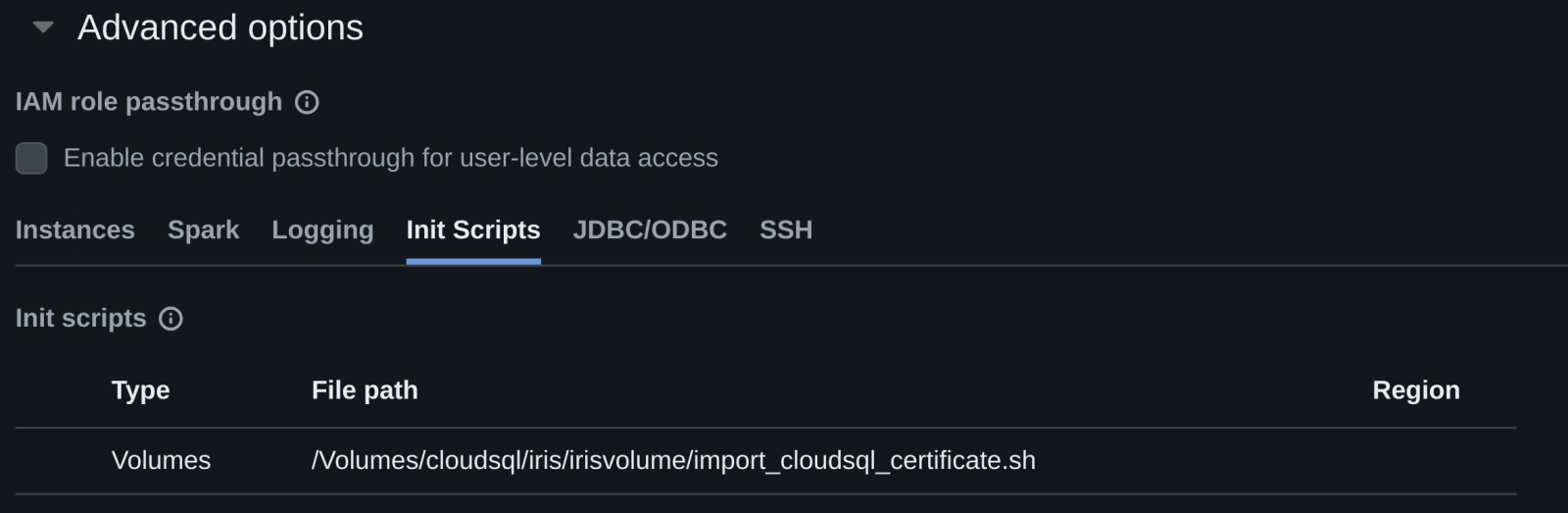 次に、クラスターの起動時に実行する初期化スクリプトが必要です。これは前の記事でいくつかの場所に使用していましたが、もう一度そのダイレクトリンクを示しておきます: import_cloudsql_certfiicate.sh。基本的に、InterSystems OMOP ポータルから証明書を貼り付けて、スクリプトをボリュームにマウントし、以下のように起動時に実行するように設定します。起動時に、環境がデータベースセキュリティに接続するはずです。