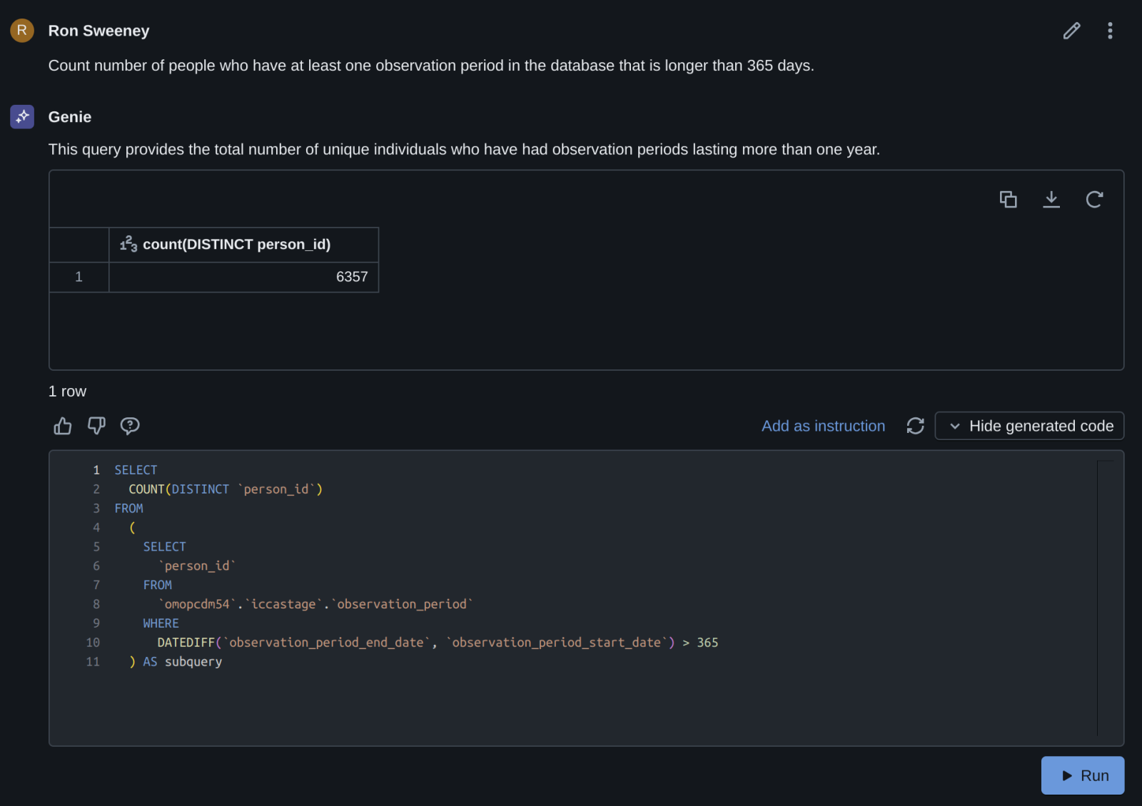 OHDSI の世界には、Atlas、Achiles、DQD、ShinyApp、OMOPSketch、さらにダイアレクト間の翻訳に役立つ有名な SQLRender(IRIS ダイアレクトもサポートされました)など、インサイトを表面化できる非常に強力なクエリの記述支援を行えるツールが多数あります。 気が遠くなる上、非常に不完全なリストです。しかし、このコミュニティを学ぶためのツールを精査したところ、いわゆる自然言語を SQL に翻訳するものは見つからなかったため、Databricks AI/BI Genie を試してみました。ここに、最初の結果の一部を示します。.png)