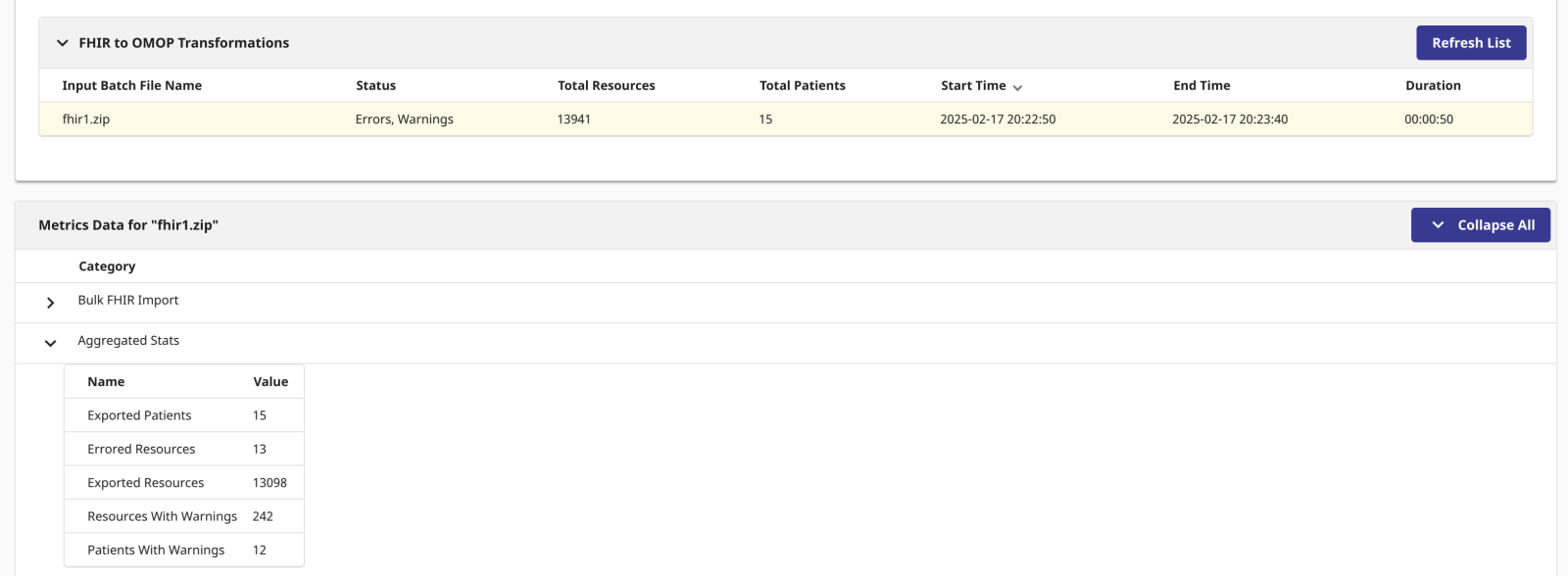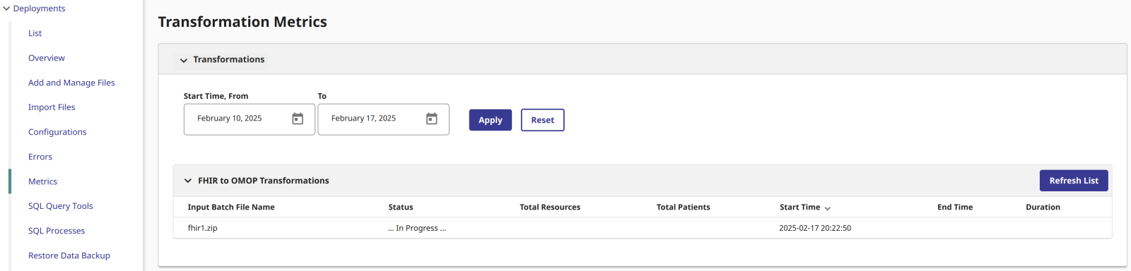 InterSystems OMOP Cloud ポータルで、パネル内の「メトリクス」に移動し、変換の結果を検査してみましょう。