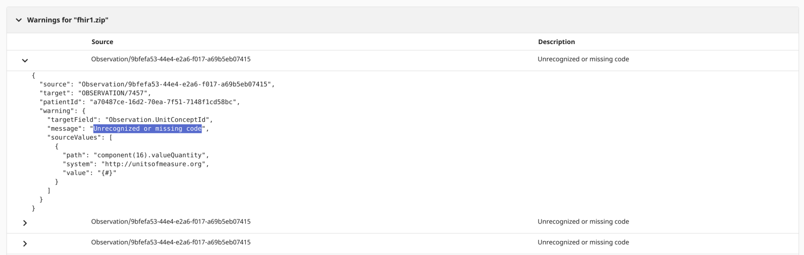 上部のペインで実行をハイライトすると、下にデータのエラーと警告の 2 つのテーブルが表示されます。エラーと警告に関する詳細な説明については、私が説明するよりも InterSystems OMOP ドキュメントを確認する方がよいでしょう。