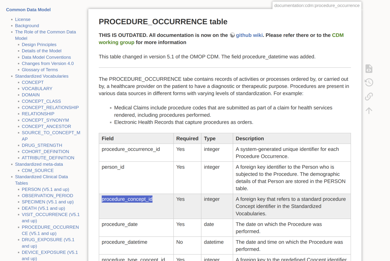 変換(OMOP データモデル経由)に重要な概念 IDE が欠落しているようです。テーブル参照に必要なフィールドは CDM documentation for Procedure で素早く確認できます。