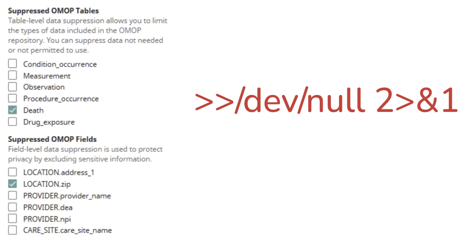 OMOP CDM データベースはすでに仮名化データベースとして分類されていますが、一部のデータがそれに送信されることに問題があると考える組織があります。フィルタリングのオプションは、テーブル全体か、テーブル内のフィールドのいずれかをビットバケットに送信します。