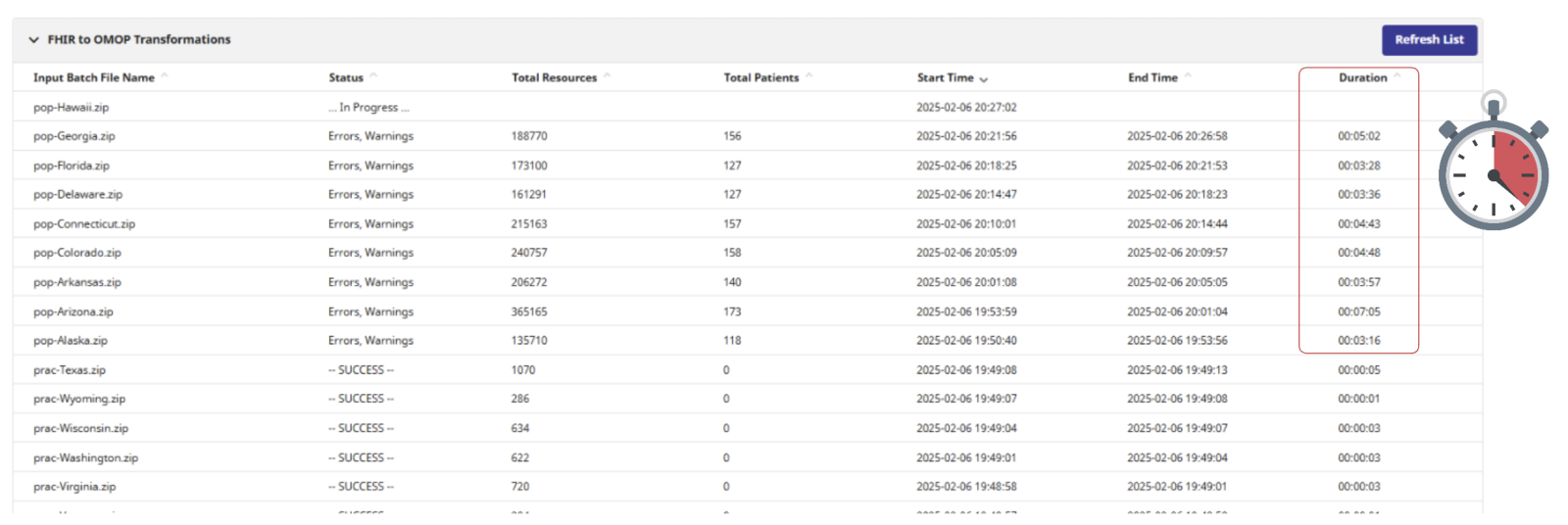 データを InterSystems OMOP CDM にロードし、州あたり約 100~200 人の患者のランダム化された母集団を使って、米国のすべての州の実行をシミュレーションしましょう。タイミングは週ごとに約 5 分程度で、使用可能な最低仕様(トライアル版)で実行します。