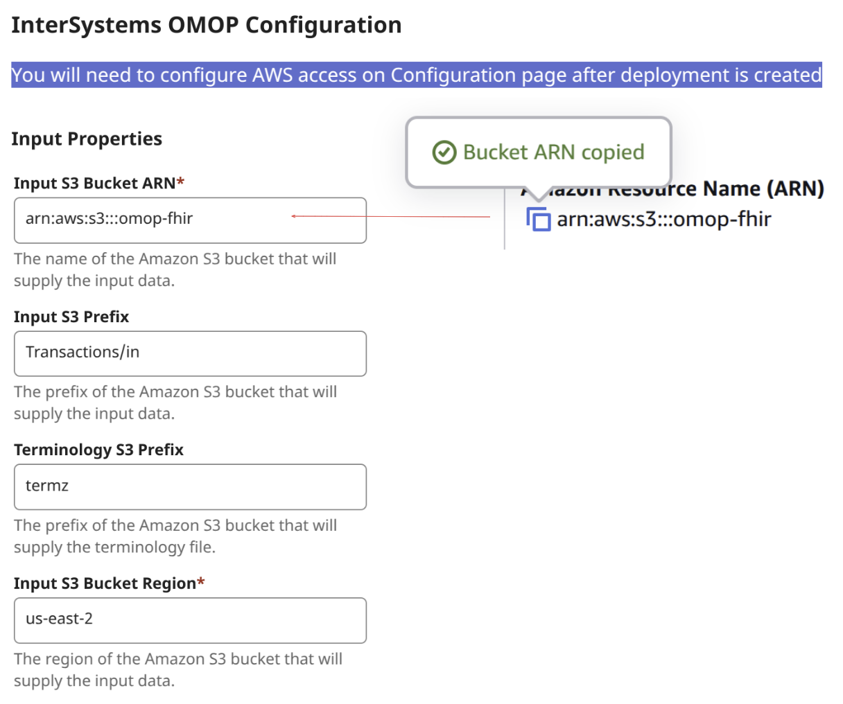 aws s3api put-object --bucket omop-fhir --key termz --profile pidtooこれで、次のようにしてサービスをプロビジョニングするように設定できるはずです。arn を要求するフィールドに注意してください。説明では名前を要求しているにもかかわらず、実際にはバケットの arn を要求しています... 小さな 👣🔫 がここにあります。.png)