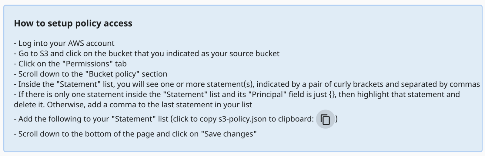 aws cloudformation update-stack --stack-name omopfhir --template-body s3-omop-fhir-bucket.yaml --parameters ParameterKey=PolicyfromOMOPConfiguration,ParameterValue="arn:aws:iam::1234567890:role/skipper-deployment-4a358965ec38ba179ebeeeeeeeeeee-Role"いずれにしても、ソースバケットのアクセス許可には、このようなポリシーが表示されるはずです... (アカウント番号、ロールは不明瞭です)