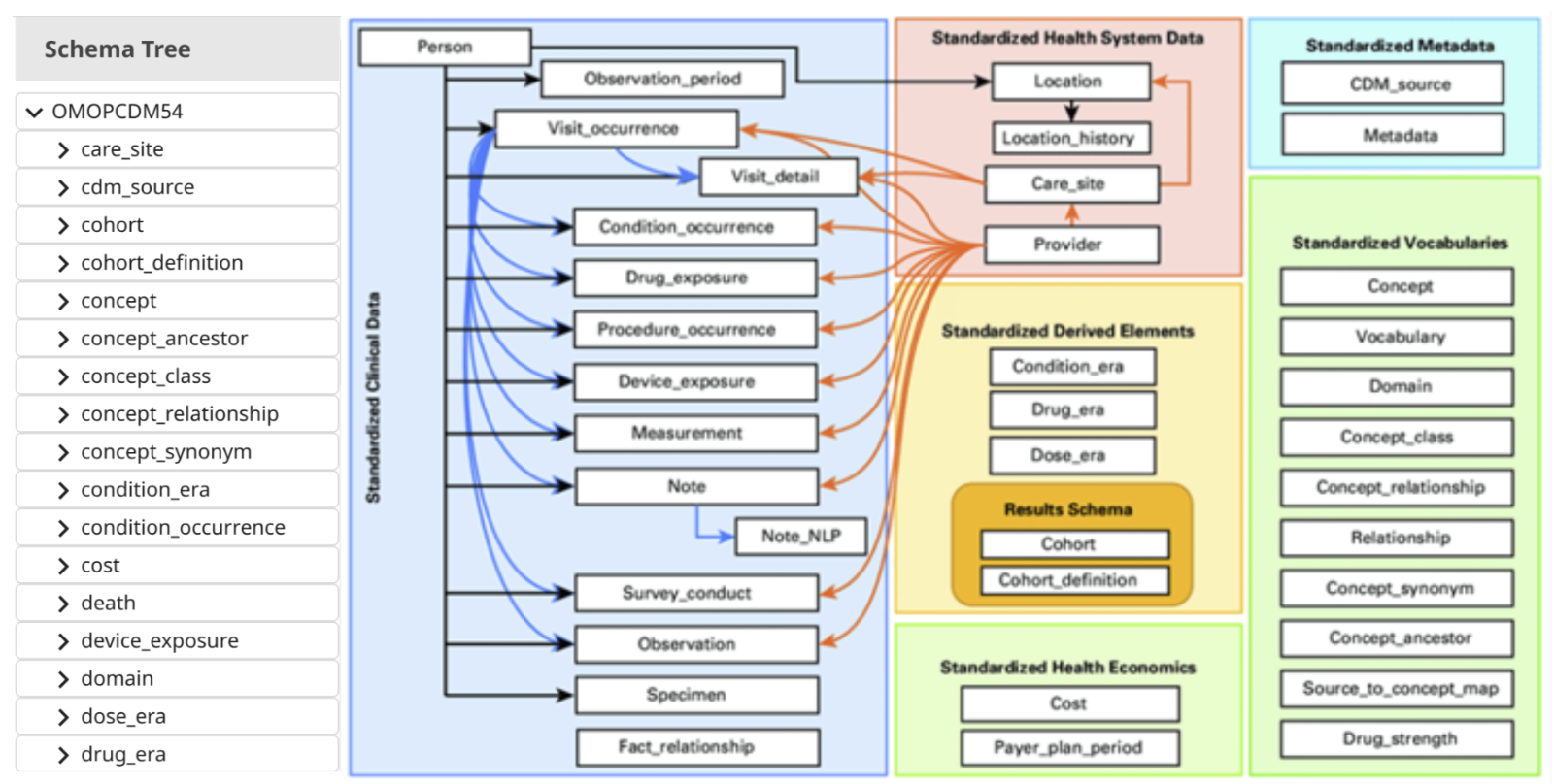 OMOP(Observational Medical Outcomes Partnership)データベースは、複数のソースをサポートするために途方もない複雑さを、CDM と呼ばれる共通データモデルにまとめる方法を示す記念碑的なものです。コミュニティ外部のさらに詳しい説明は、コピペコンテンツ(またはさらに酷い生成コンテンツ)になりますが、このコミュニティのドキュメントは本当によくできています。