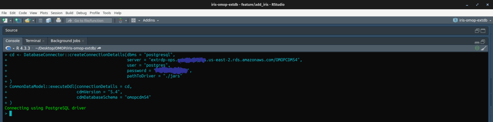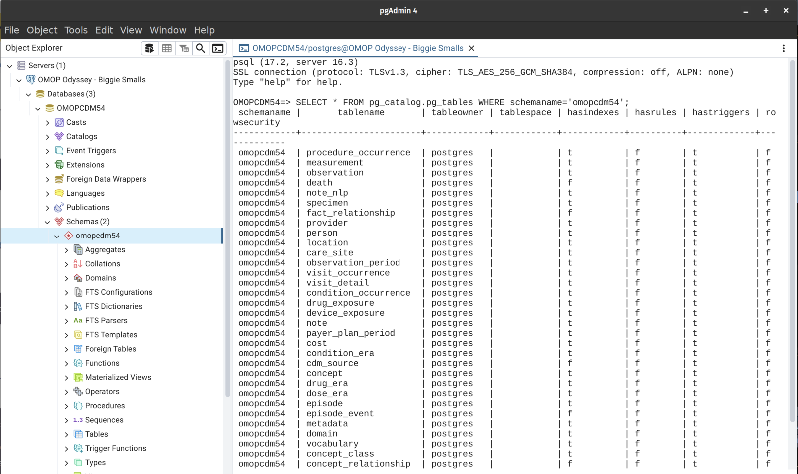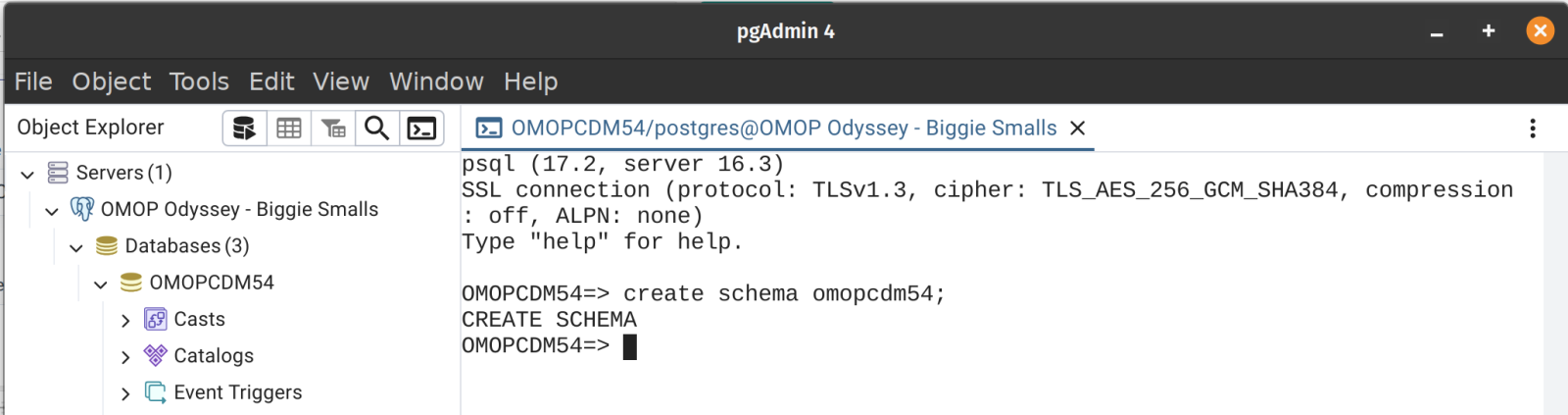 downloadJdbcDrivers("postgresql")必要なものが揃ったので、postgres インスタンスに接続し、上記でプロビジョニングした OMOPCDM54 にテーブルを作成しました。