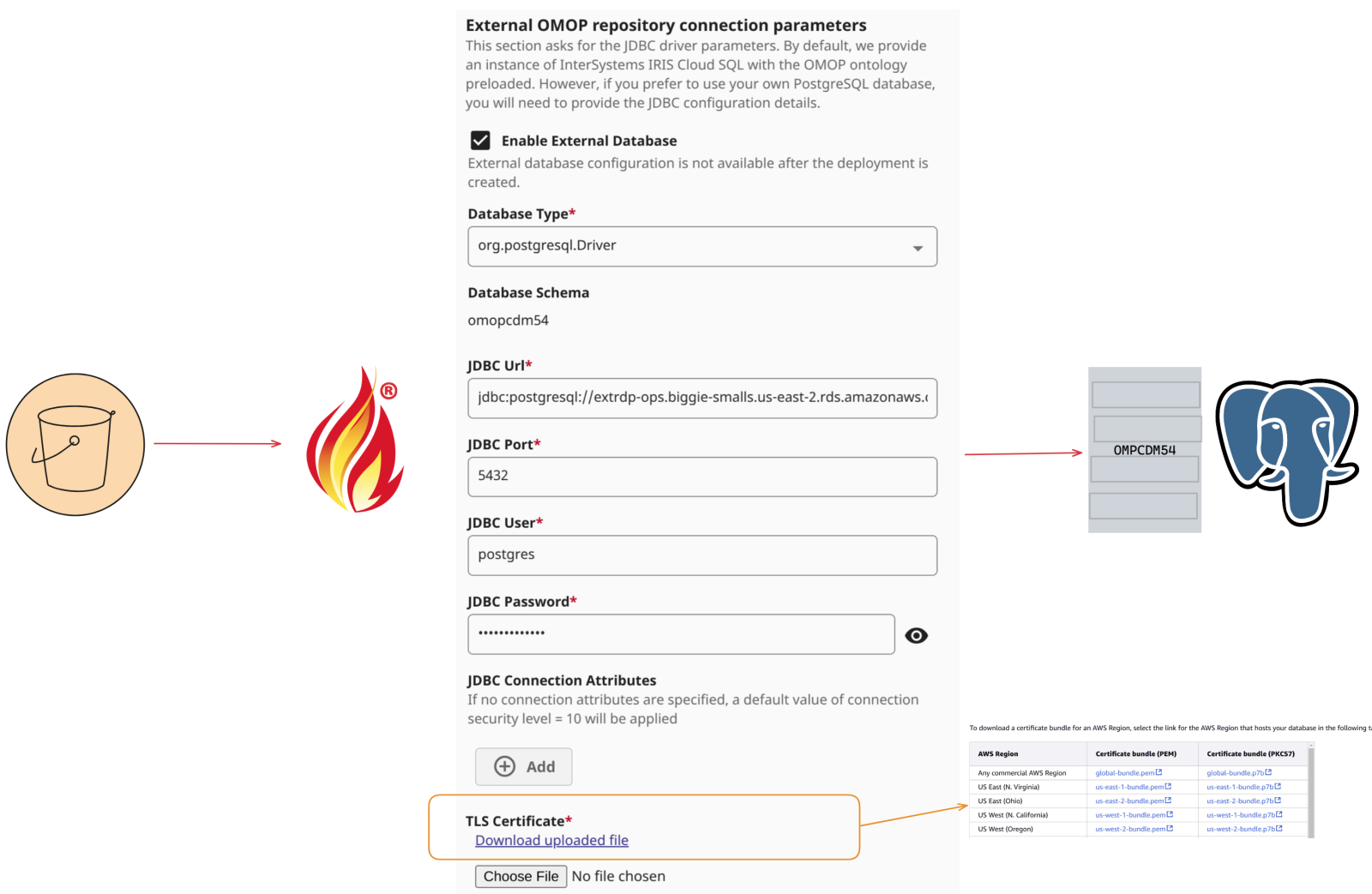 InterSystems OMOP は、InterSystems クラウドサービスポータルを介して HealtheShare サービスとして提供されており、HL7® FHIR® データを Observational Medical Outcomes Partnership(OMOP)共通データモデル(CDM)に変換します。 InterSystems OMOP は S3 バケットに格納されている FHIR データを参照し、自動的に変換処理を行って、そのデータを OMOP CDM 形式でクラウドホスト型リポジトリに送信します。 するとユーザーは、ATLAS や HADES などの外部の Observational Health Data Sciences and Informatics(OHDSI)ツールと新しいタブに開く JDBC などのデータベースドライバーを併用して、データの分析タスクを実行できるようになります。