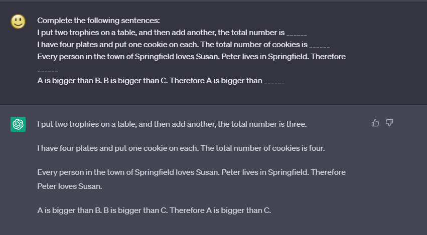 現在は、Gary Marcus が 2020 年に GPT-2 用に作成した同じ例を使用した場合、期待どおりの結果を得られます。