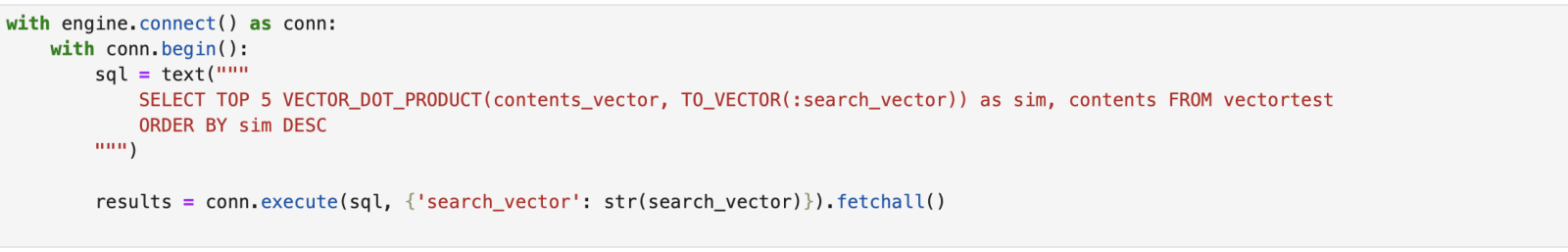 set sql="SELECT TOP 5 VECTOR_DOT_PRODUCT(contentsv, TO_VECTOR(?, DOUBLE, 768)) as sim, contents"set sql=sql_" FROM SQLUser.nakav3 ORDER BY sim DESC"set rs=##class(%SQL.Statement).%ExecDirect(.stmt,.sql,.questionv)