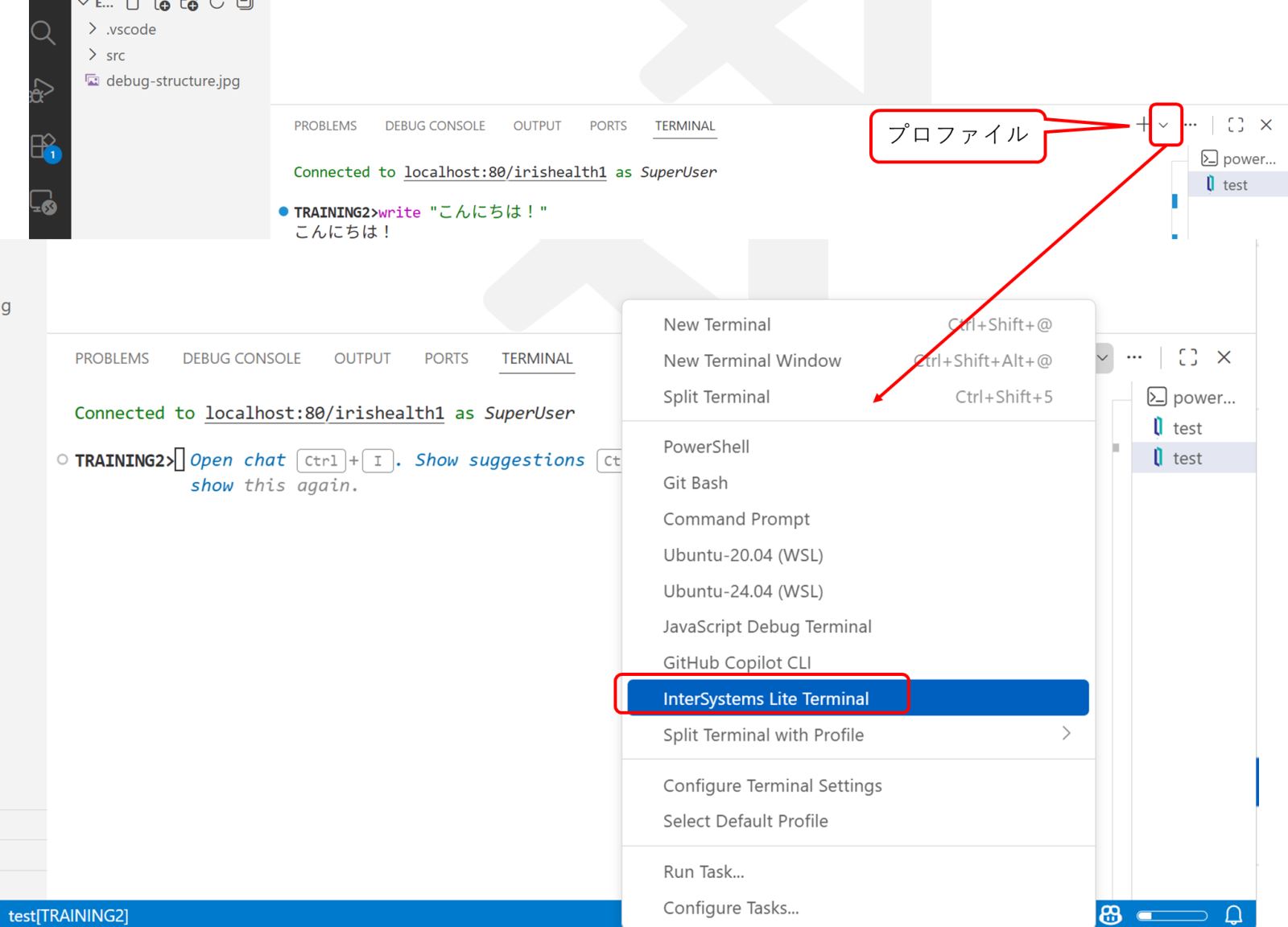 ところが今回、ObjectScript エクステンションに追加された「ObjectScript Lite Terminal」を利用することで、VSCode 1 画面内で IRIS ターミナルを操作できるようになりました。