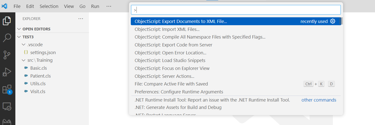 VSCodeの View → Command Pallet.. をクリックし「ObjectScrpt: Export Documents to XML File...」を選択します。