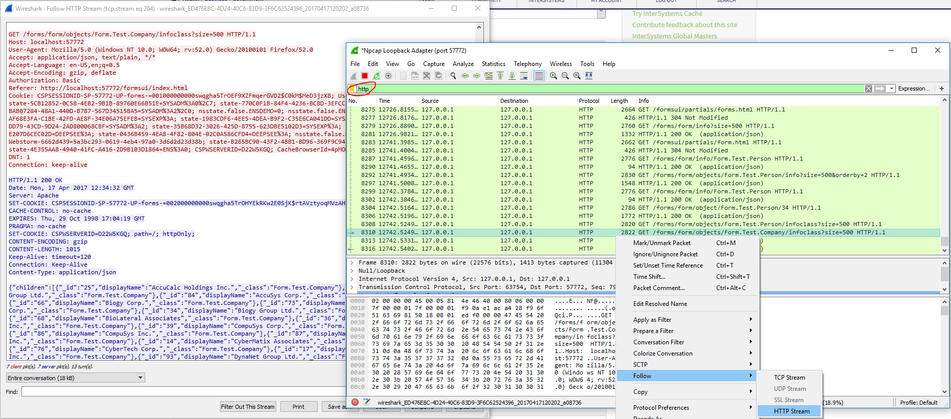 以下は、ポート57772(キャプチャフィルタ)のhttpトラフィック(表示フィルタ)をキャプチャした例です。