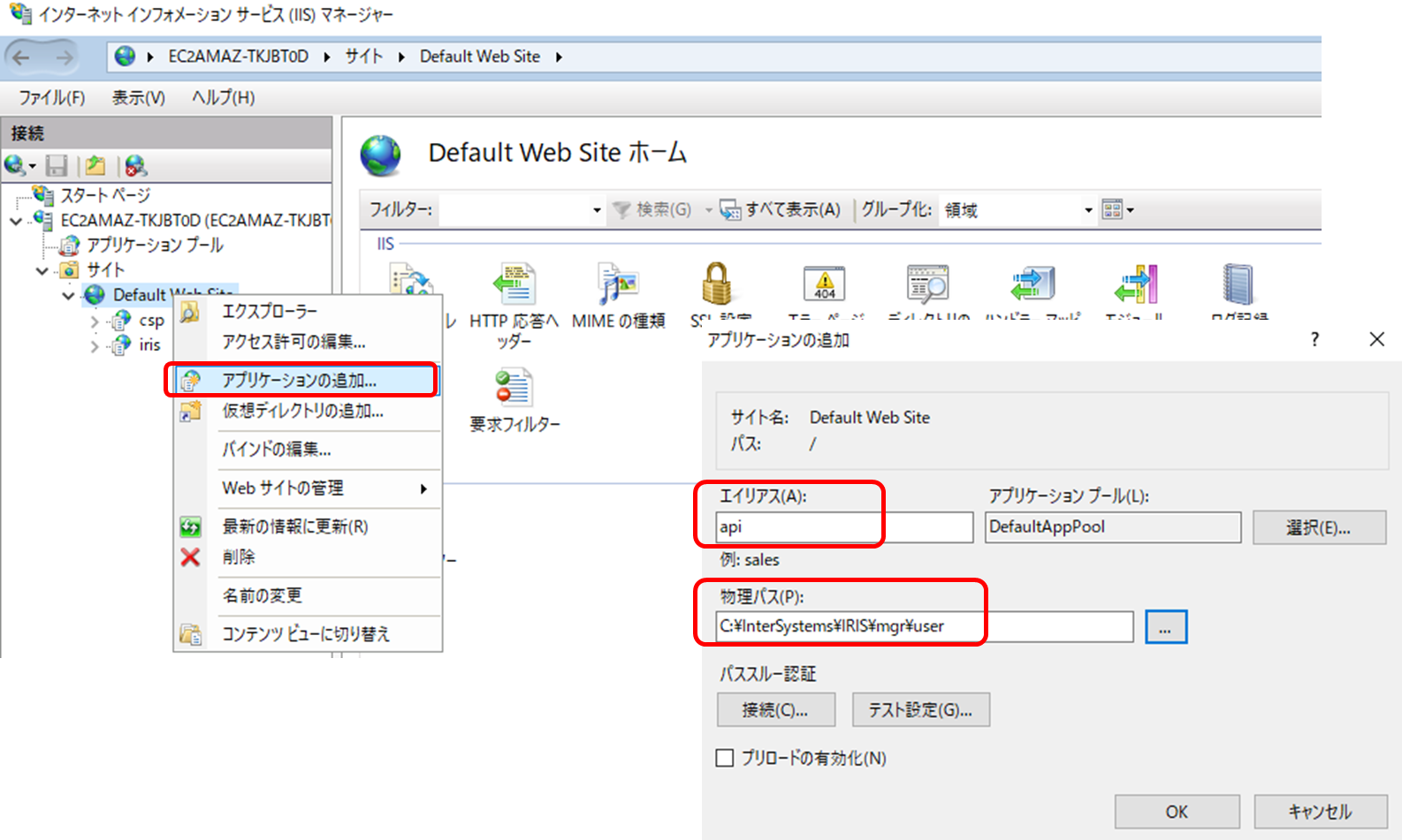 1. Default Web Site を右クリックし、「アプリケーションの追加」を選択します。