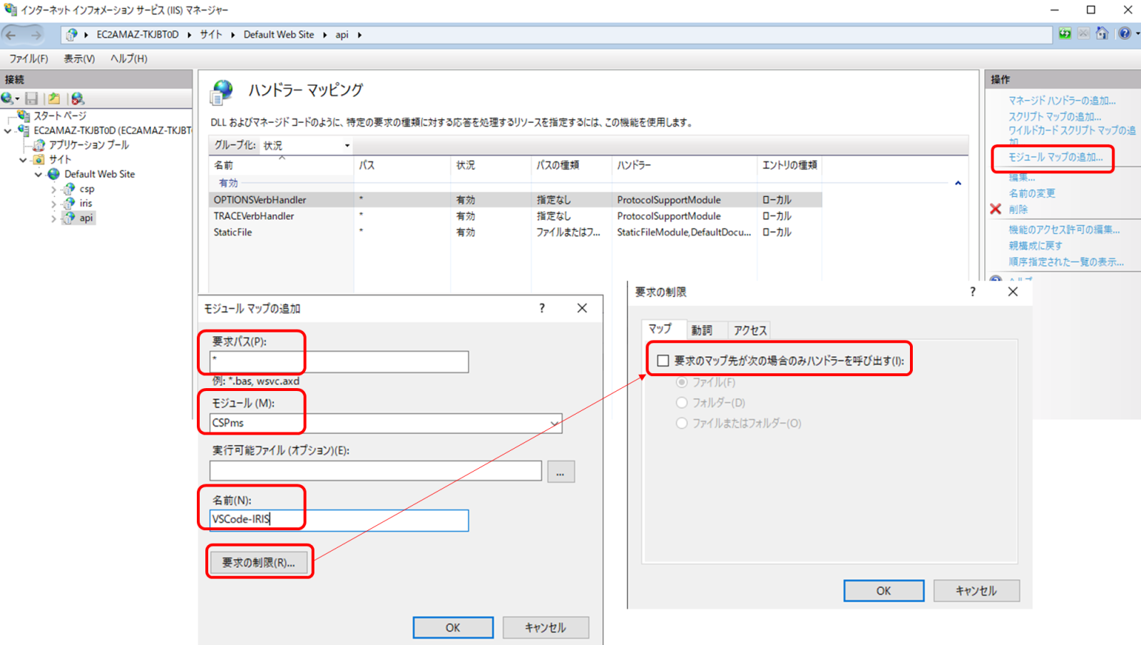 4. 「モジュールマップの追加」を選択し、要求パスに * を、モジュールに CSPms、名前に任意名を設定します。また、「要求の制限」ボタンをクリックし、「要求のマップ先が次の場合のみハンドラーを呼び出す」のチェックを外しOKボタンをクリックします。