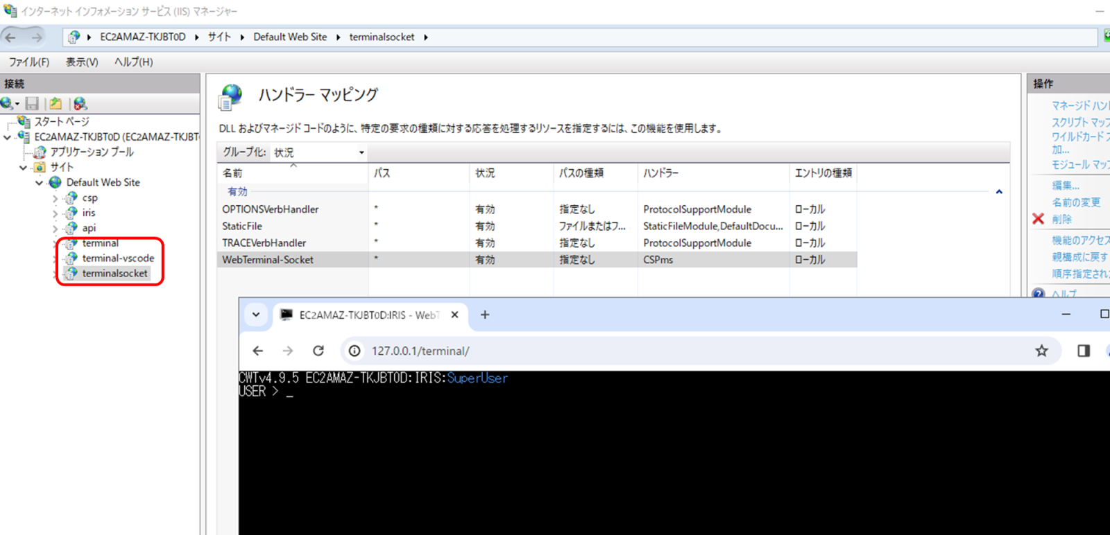 インポート後、REST用パス /terminal がInterSystems製品上に作成されますので、後はWebサーバ側(IISやApache)に 以下のパスを追加するだけでアクセスできます。