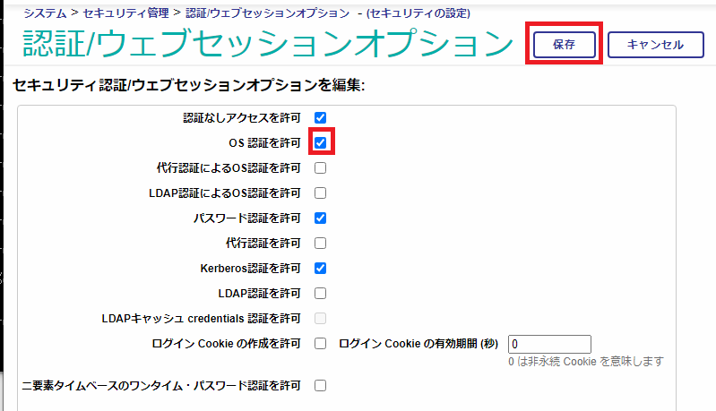 - 以下のページが表示されますので、「OS認証を許可」をチェックし、「保存」ボタンをクリックします。