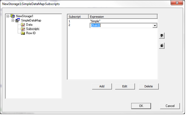 次は添え字を定義したいと思います。 ここでは、グローバルの添え字を IdKey まで (IdKey を含む) すべて定義します (IdKey には 複数の添え字が使われる場合があります)。 式ボックスでフィールドを参照するには、そのフィールドを {} の中に入れます。 有効な COS 式であれば、どのような式でも入力できます。 ここではシンプルに、Subscript 1 には定数を、Subscript 2 にはフィールドを使用しています。