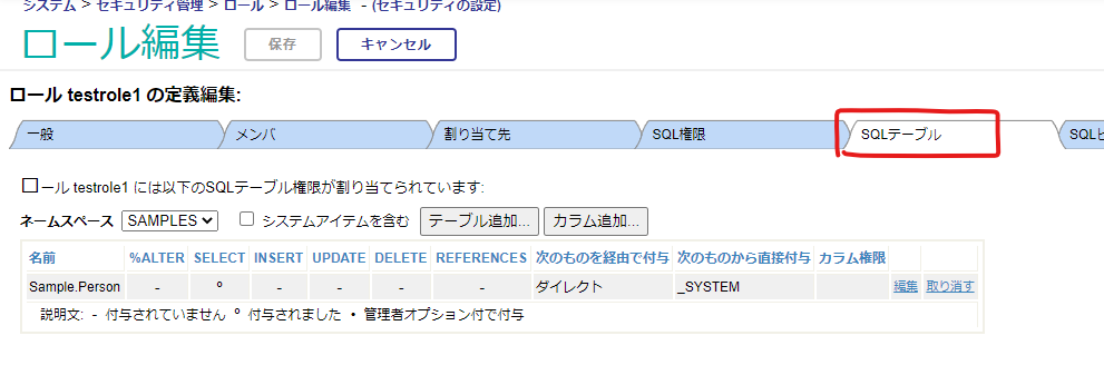 管理ポータルでの設定は、ユーザまたはロールの編集画面内「SQLテーブル」タブを使用します。