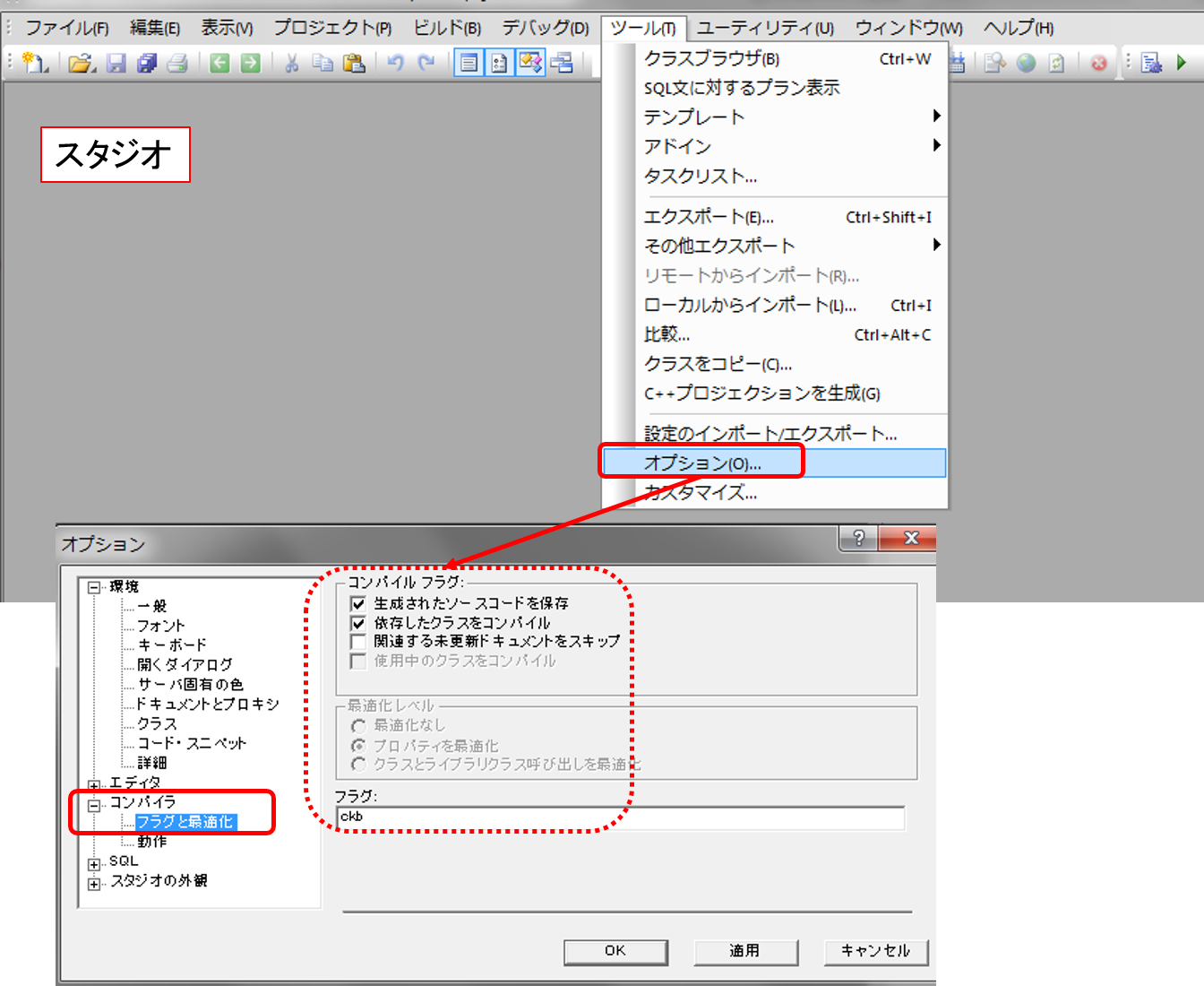 • スタジオは、[ツール] > [オプション] > [コンパイラ] > [フラグと最適化]