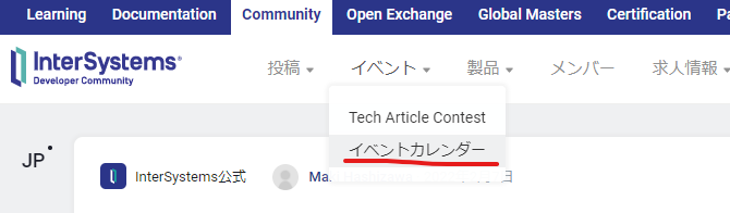 コミュニティページ画面上に、「イベント」のメニューがあります。