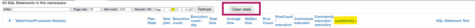 一般的に、実行されたSQLクエリに関する基本的な統計情報 は保持しております。 キャッシュされたSQLクエリを削除する際、ステートメントリスト内のステートメントエントリ自体は削除せず、統計情報は保持いたします(将来の比較に役立つ可能性があるためです)。ただし、ロケーション列は「クリア」します(既存のキャッシュ済みクエリを指さなくなるためです)。 これらの「古い」ステートメント(もはやどこも指していないもの)をクリーンアップしたい場合は、「古いステートメントをクリーンアップ」ボタンを押することができます。