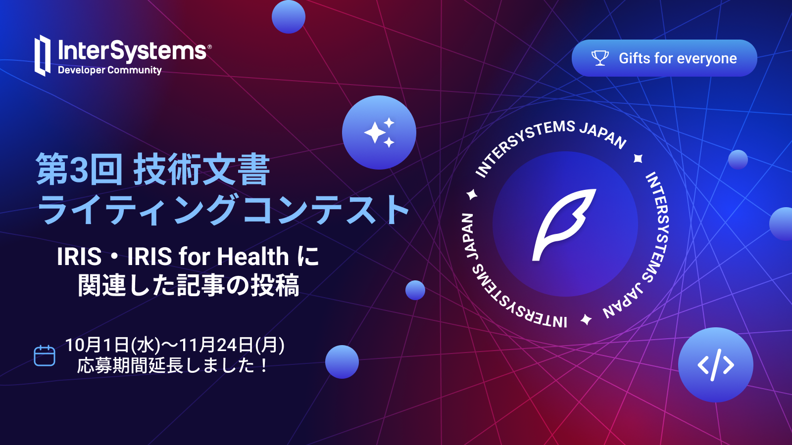 お知らせ Mihoko Iijima · 2025年9月9日 第3回 InterSystems Japan 技術文書ライティングコンテスト 開催! 開発者の皆さん、こんにちは! 今年で 3 回目となりますが、✍ 技術文書ライティングコンテスト✍ 開催します! 📣 9/26更新:賞品、参加賞決定しました! 📣 9/29更新:コンテスト投稿一覧ページ準備完了です! 📣 11/6更新:応募期間を1週間延長し、応募締切は11月24日(月)に変更しました! テーマはいつもと同じで InterSystems IRIS/InterSystems IRIS for Health に関連した内容であればどのような内容でもご応募いただけます。 🎁 参加賞:投稿いただいた方全員に「モバイルバッテリー」をプレゼント! 🏆 特別賞:選ばれた3作品に、今年も特別賞あります!詳細はこちら コンテストへの応募はとても簡単です。2025年10月1日(水)~11月17日24日(月)までの期間に開発者コミュニティに「IRISに関連した記事」を投稿してください。 もちろん!今年も🍆ボーナスポイント🍆あります!こちらをご参照ください! #イベント #コンテスト #InterSystems IRIS #InterSystems IRIS for Health #IRIS contest 0 1 0 90