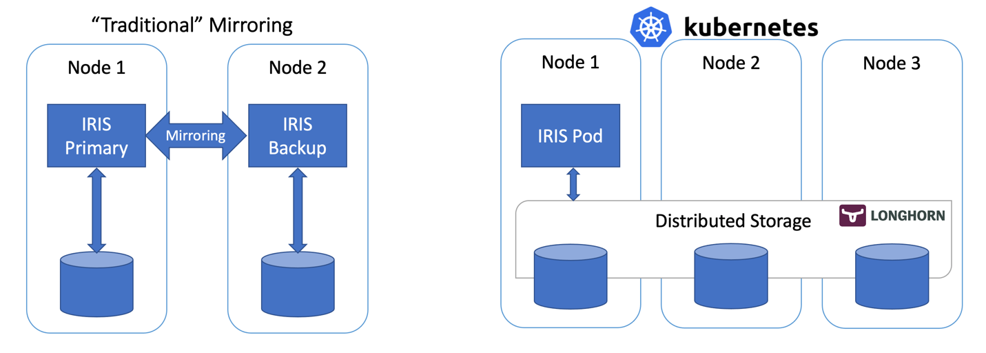 この記事では、従来のIRISミラーリング構成の代わりに、Kubernetesの Deploymentと分散永続ストレージを使って高可用性IRIS構成を構築します。 このデプロイでは、ノード、ストレージ、アベイラビリティーゾーンといったインフラストラクチャ関連の障害に耐えることが可能です。 以下に説明する方法を使用することで、RTOがわずかに延長されますが、デプロイの複雑さが大幅に軽減されます。