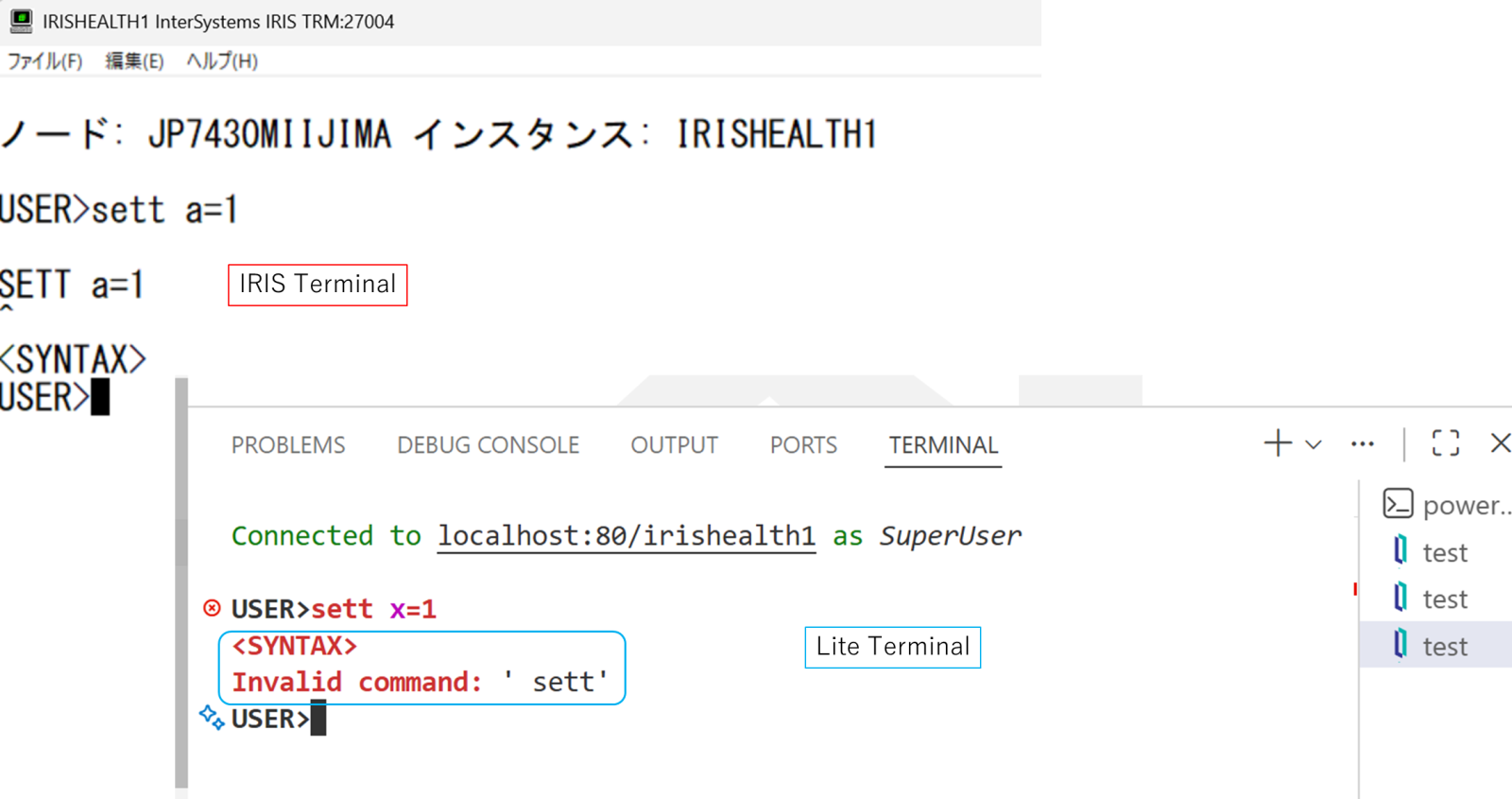 ところが今回、ObjectScript エクステンションに追加された「ObjectScript Lite Terminal」を利用することで、VSCode 1 画面内で IRIS ターミナルを操作できるようになりました。